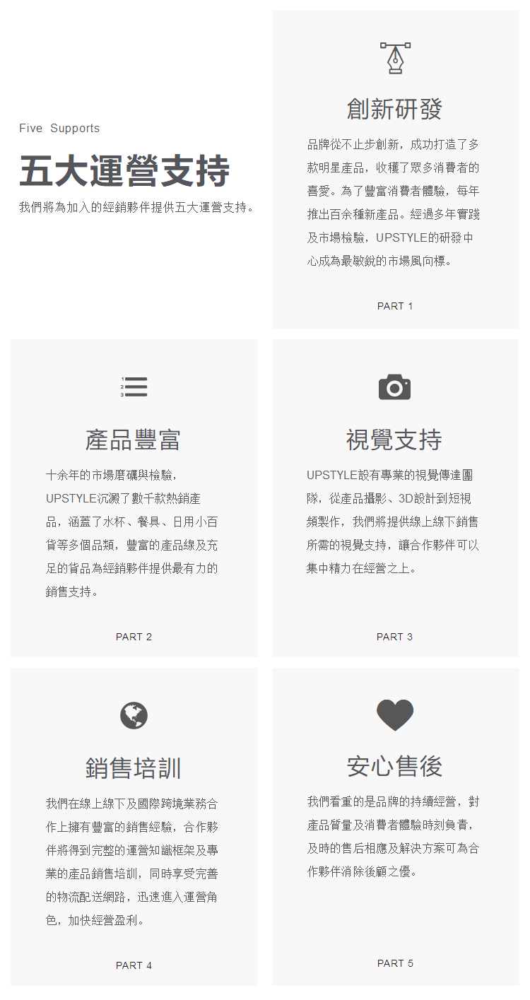 為了能讓更多的消費者體驗UPSTYLE產品,分享UPSTYLE「創造,改變生活」的品牌願景,現向台灣地區首次開放經銷代理及品牌授權合作,只要滿足一定合作條件,即可被授予產品代理及品牌授權合作。我們將以更開放的合作模式和更完善的運營支持歡迎更多志同道合的人加入,一起共創未來。